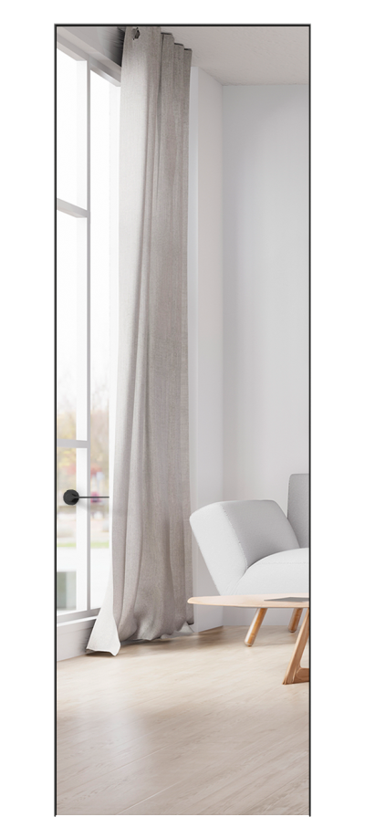 Полностью зеркальное полотно идеально подойдёт для спальни, гардеробной или ванной комнаты. При этом зеркало может быть установлено как с одной, так и с двух сторон. А открывание двери может быть прямым — на себя или обратным — от себя. Максимальная высота зеркального полотна в двери 2500 мм.